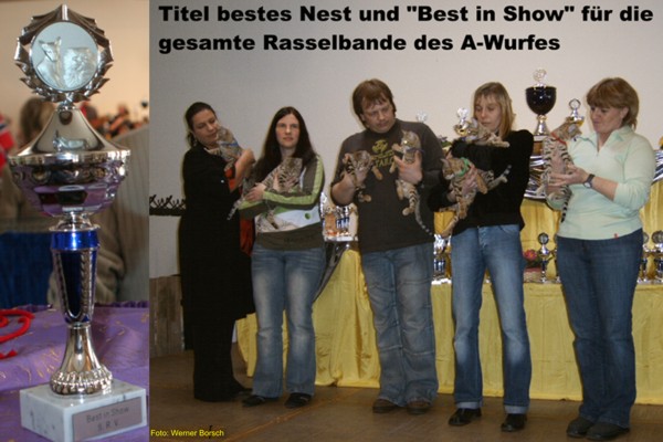 Auf der Internationalen Katzenschau in Olpe wurde unser Nest bestes Nest und "Best in Show" im Richterprotokoll wurde die Ausnahmequalität aller 7 Nachkommen bestätigt (das komplette Protokoll finden Sie unter "A-Wurf -- Fotos Wurf").