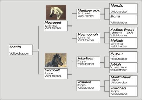 Lange haben wir nach dem geeigneten Hengst für Skarabell gesucht und uns dann für den Spitzenhengst Messaoud entschieden. Am 11.06.2005 wurde dann Sharifah geboren. Sie ist kerngesund und durch Imprinting besonders lässig und menschenbezogen. Wie man erkennen kann, ist Sie mit einem Super-Exterieur ausgestattet und besitzt einen traumhaft typvollen Kopf. Eine Zukunft als Zuchtstute bei uns ist ihr sicher.