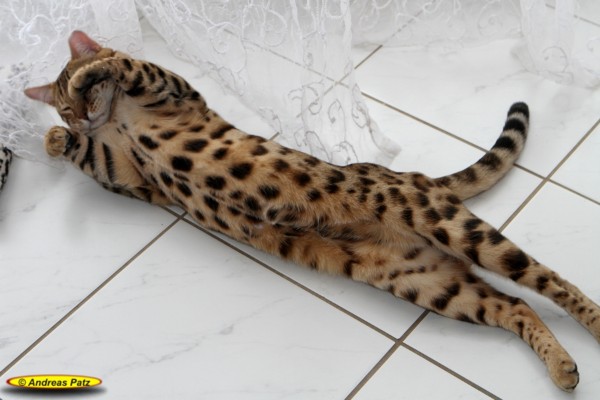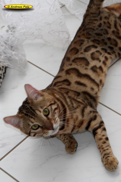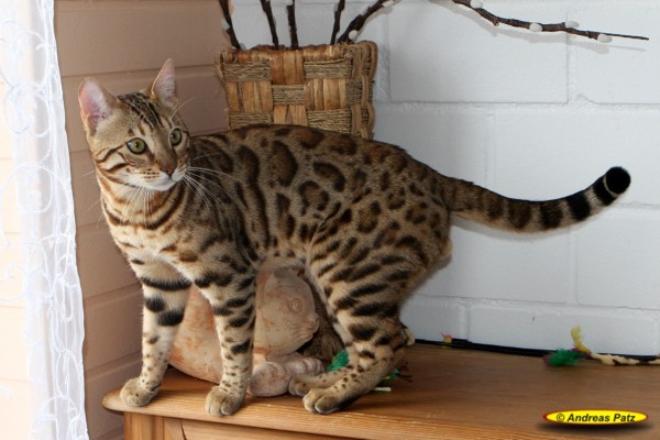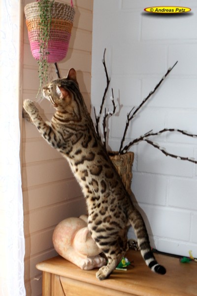 Er hat tolle Rosetten, einen traumhaften Kopf und einen super Körperbau. Sein Schwanz ist wie bei den Bengalen gewünscht kurz und dick. Er hat einen tollen Wildtyp und ist dabei sehr groß (schon 5,5 Kg mit zehn Monaten). Bronte ergänzt unser Zuchtprogramm in idealer Weise. Wir danken Kelly, dass sie uns diesen tollen Ausnahme-Kater anvertraut hat.