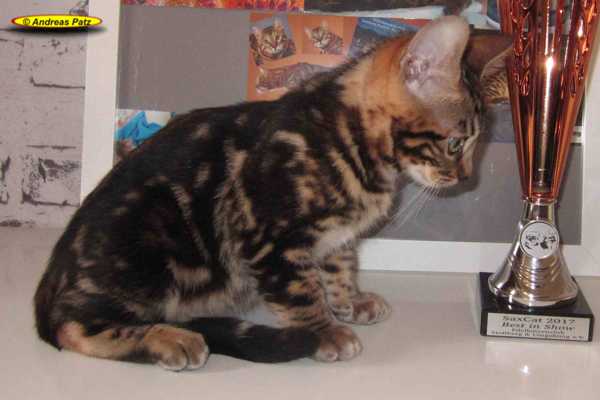 September 2016: Wir haben auf der Belgian On Safari mit drei unserer Nachwuchs Bengalkatzen teil- genommen. Diese haben überragend abgeschnitten. Unter anderem wurden folgende Titel erreicht: Beste weibliche Bengalkatze, bestes weibliches Bengalkitten, bester Kopf, bestes Profil, bester Körperbau, beste Ohren, bester Schwanz, bester Wildtyp, beste Augen, bestes Schnurrhaarkissen, schönste Rosetten Erwachsene Bengalkatzen, schönste Rosetten Kitten. Insgesamt haben die "Drei" 27 Schleifen errungen - besser geht es kaum. Wir sind sehr stolz auf unseren Nachwuchs :-).