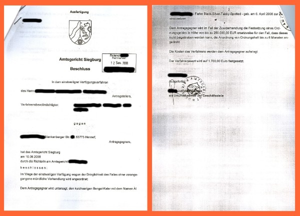 Nach einem Gespräch mit dem Anwalt des Züchterbundes stand die Entscheidung gerichtlich gegen Dirk P. vorzugehen fest. Wir beantragten eine einstweilige Verfügung, die Herrn P. verbietet mit dem Bengalen Al Jannas Hoomer zu züchten. Die Richterin am Amtsgericht Siegburg gab uns Recht und erließ die einstweilige Verfügung am 16.08.2008. Der Anwalt von Dirk P. legte Einspruch gegen diese Verfügung ein und es kam zur mündlichen Verhandlung. In der Verhandlung wurden mehrere Vergleiche vorgeschlagen. Unter anderem, dass wir unseren Hoomer für den vollen Kaufpreis zurück nehmen. Dies wurde von Herrn Dirk P. abgelehnt – er wollte unbedingt vertragswidrig mit Hoomer in die Bengalzucht einsteigen. Die Richterin bestätigte daraufhin Ihre Verfügung und erklärte, dass ein Züchter sehr wohl entscheiden kann, ob mit einem Tier gezüchtet wird oder nicht. Es wurde Herrn Dirk P. für den Fall der Zuwiderhandlung ein Ordnungsgeld bis zu 250.000 Euro angedroht.